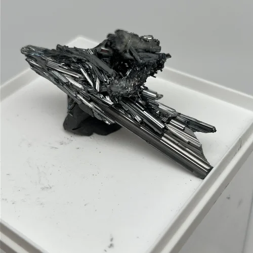 Антимонит — это камень с характерной игольчатой и призматической формой кристаллов, обладающий высокой плотностью и блеском. Он часто образует веерообразные сростки и известен своей совершенной спайностью по {010}.